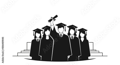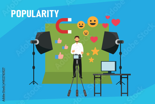Huge professional video camera and micro characters film crew shooting movie, vector flat illustration. Videographer, director, girl with clapperboard making film. Cinema industry, movie production.