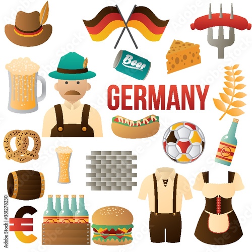 Viking set, flat vector isolated illustration. Viking male and female cartoon characters, weapons, drakkar ship. Scandinavian warrior costume and equipment.
