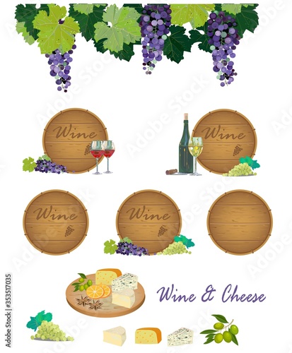 Vineyard landscape and winery field with villa farm house. Hand draw vector illustration poster. Wine wooden barrels in winery cellar. White wine bottle and vine. Man cut vine from grape tree.