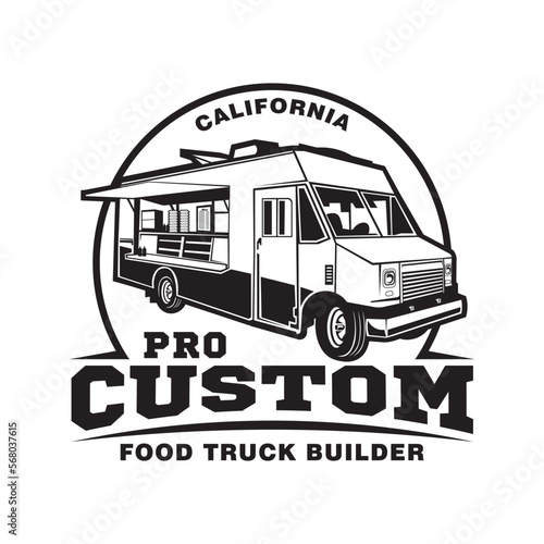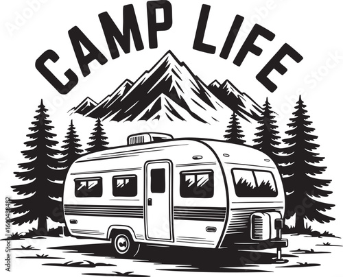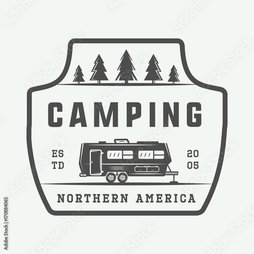 Camp logo vector. Vintage rv adventure badge. Summer road travel in forest mountain by trailer van retro emblem icon isolated on white background