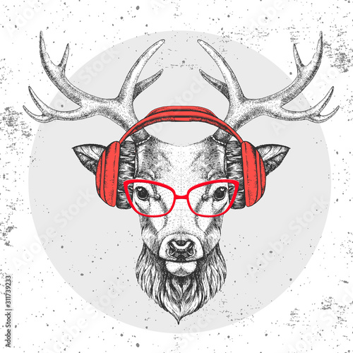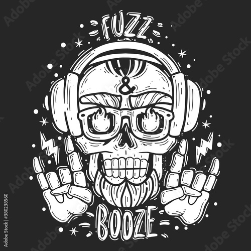Rock Star vintage grunge design for t-shirt. Vector hand drawn illustration of bald skull with mustache, beard and devil horns listening to music.