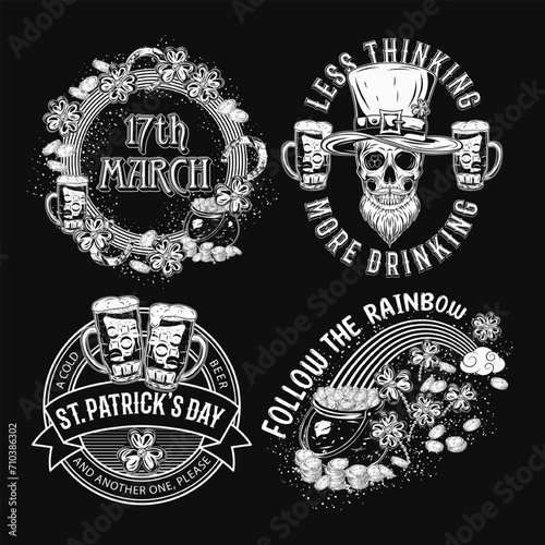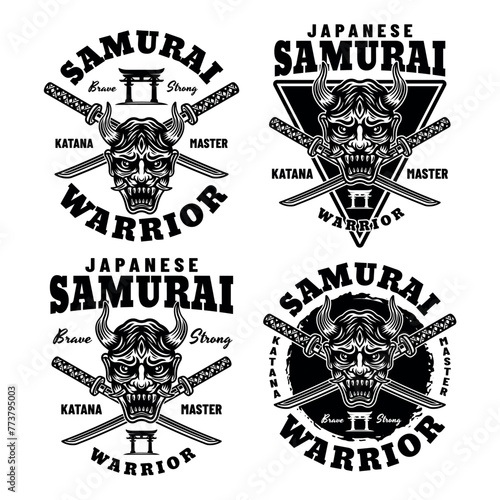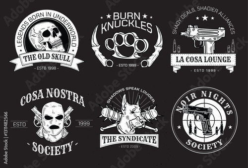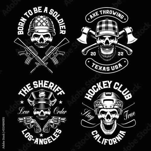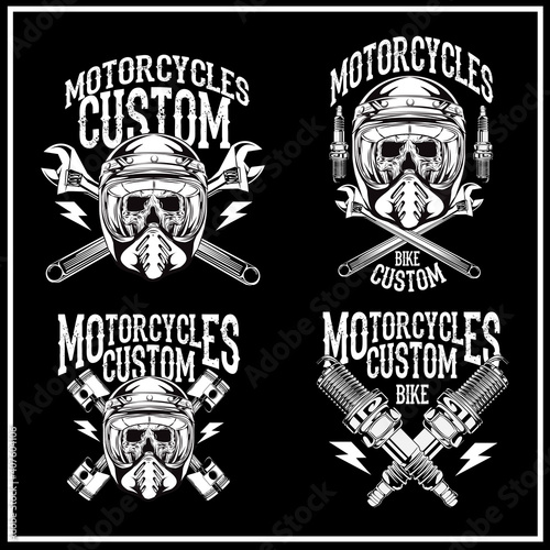 Vintage white moto skull logos, emblems, badges and labels, vector illustration isolated on black background. Motorcycle, biker skulls in helmet, goggles and face scarf, repair tools, text.