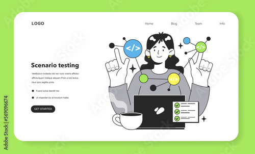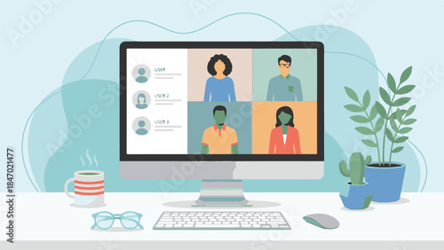 Virtual assistant business concept vector flat illustration. Huge computer monitor with micro characters business assistants engaged in office work on screen.