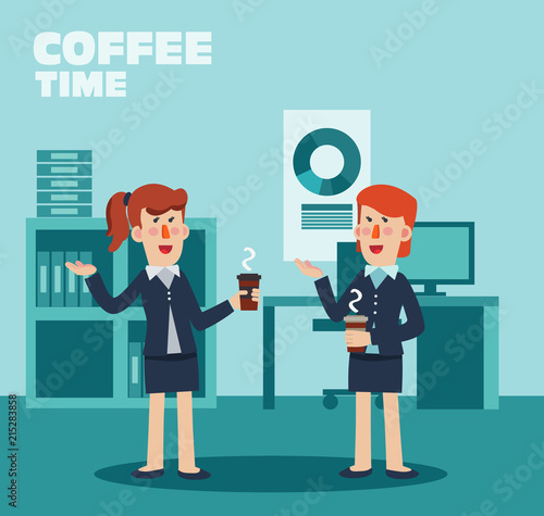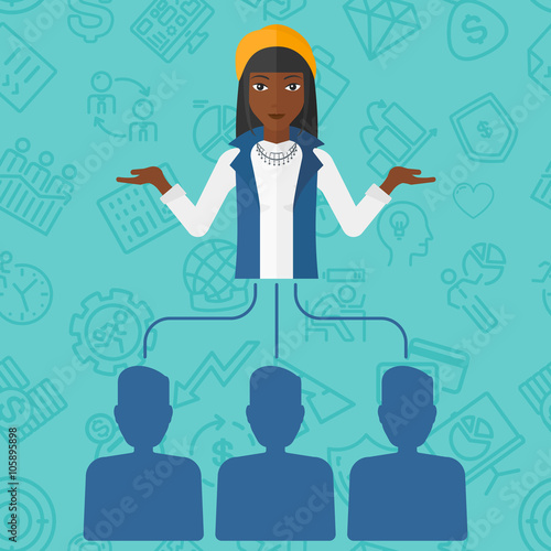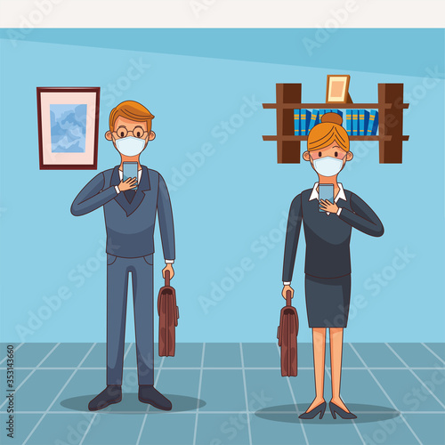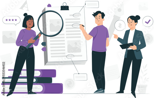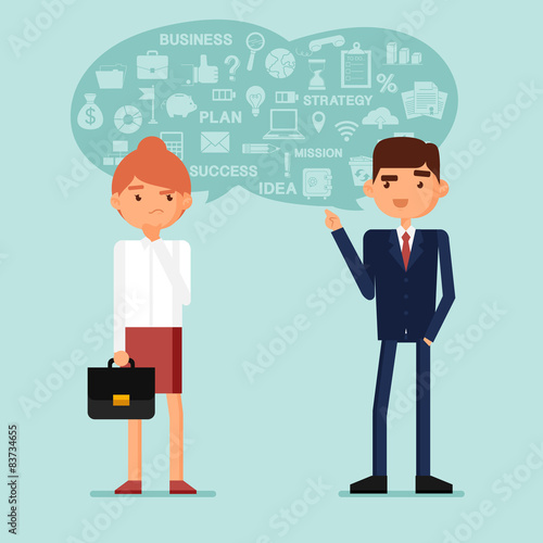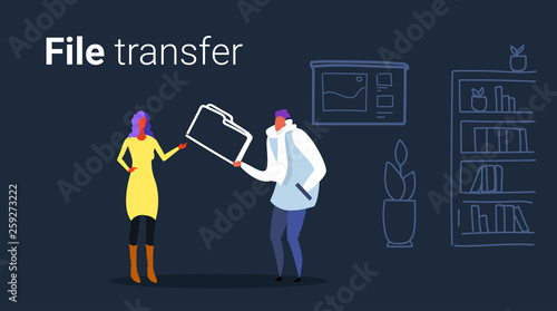 Virtual reality technology concept vector illustration. Business people man and woman wearing virtual reality glasses standing next to chalkboard and pointing at business finance graphs on it.