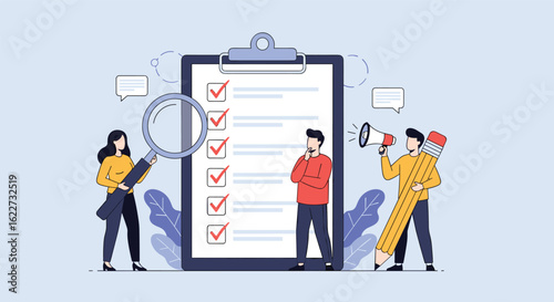 Visagiste services, vector flat style design illustration. Big eyeshadow palette and tiny characters professional makeup artists holding big brush, foundation tube. Beauty and makeup course, class.