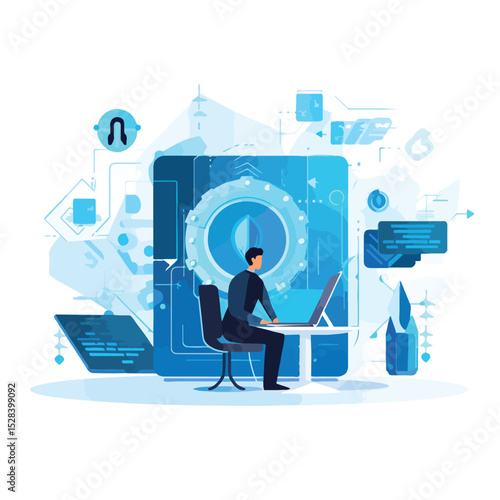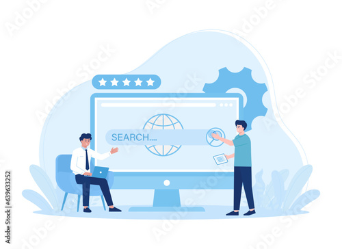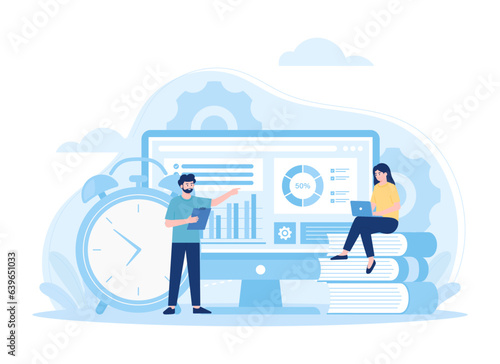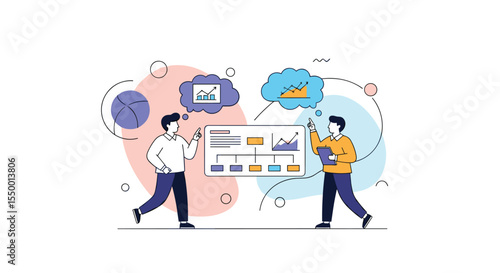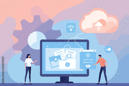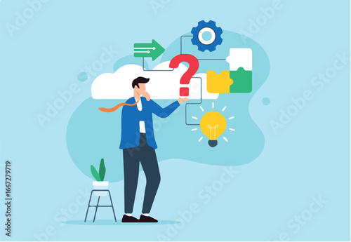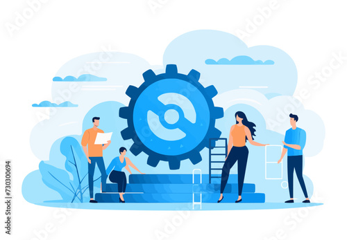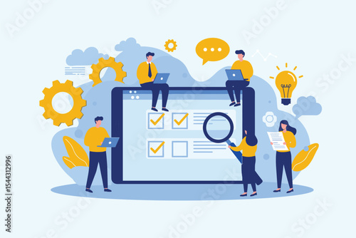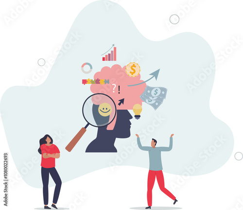Visualization. Giant human eye, tiny male and female characters wishing for new car, summer beach travel, wealth, pet dog, flat vector illustration. Optimistic thinking, follow your dream concept.