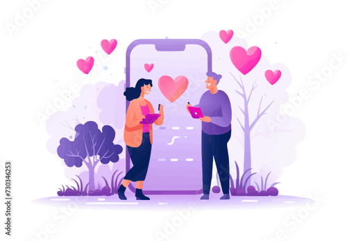 Male and female characters volunteers cleaning street, vector illustration. People collecting leaves and sweeping waste with broom. Volunteering, ecology, save environment concept for website page etc