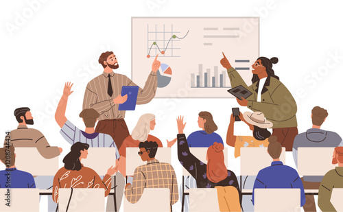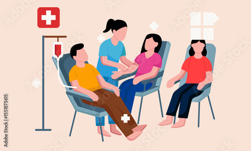 Volunteers collecting money, food, clothes for homeless people, flat vector illustration. Humanitarian aid, donation box. Volunteering, charity, care for homeless, food drive.