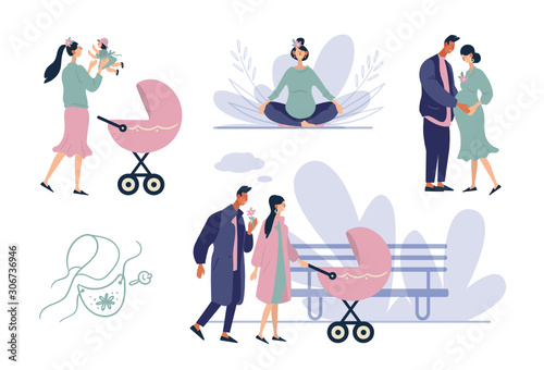 Volunteers walking, feeding stray dogs, cleaning up beach trash, buying food for people with disabilities, flat vector isolated illustration. Charity, volunteering.