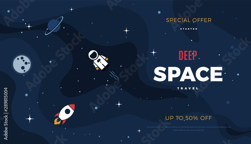 VR technology landing page website template. Vector isometric illustration of boy with VR headset in outer space. Virtual reality for education and games concept.