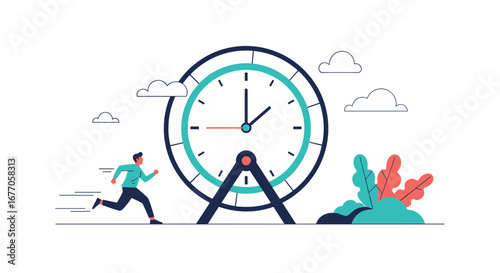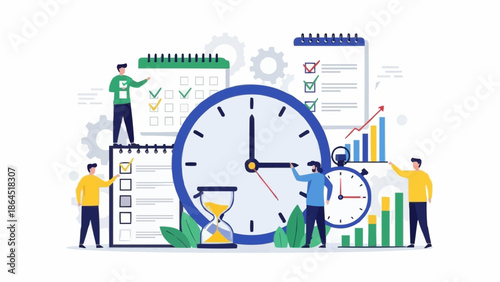 Alarm clock, tiny characters sleeping, awaking, drinking coffee, vector flat illustration. Alarm clock reminder mobile phone app. Office activity and break reminder, wake up alarms and sleep timers.