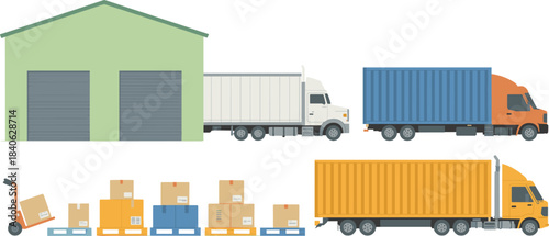 Warehouse industry cargo truck service logistics and distribution flat vector illustration. Factory for storage parcel package, merchandise and export import freight box