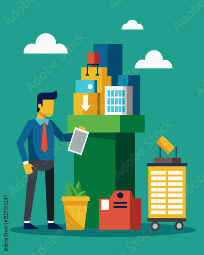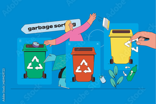 Waste plastic sorting vector flat style design illustration. Orange garbage container with recycle symbol, empty plastic bottles, containers. Ecology and recycle concept for web banner, website page.