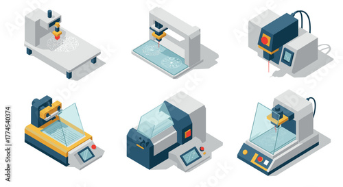 Waste sorting and recycling process isometric icon set, vector illustration isolated on white background. Garbage recycling equipment, plant, trash truck and cans, plastic paper glass household waste.