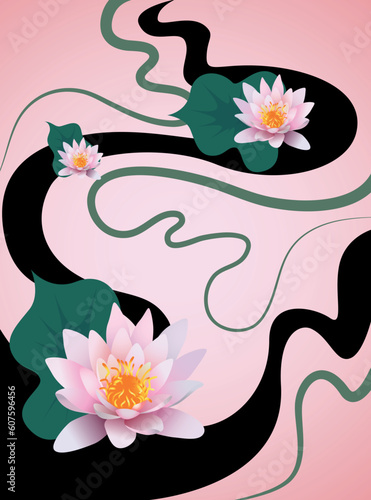 Abstract floral background with lotus water lily flowers, koi fish, water pond. Vector illustration in paper cut style.