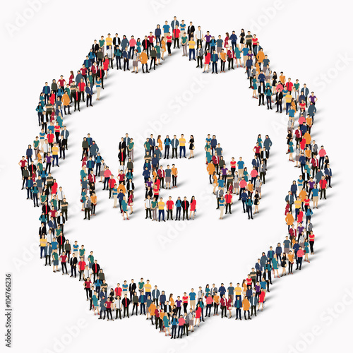 We are open sign, typography banner. Large group of people standing together in shape of letters, flat vector illustration. People crowd gathering. Business reopening after coronavirus pandemic, etc.