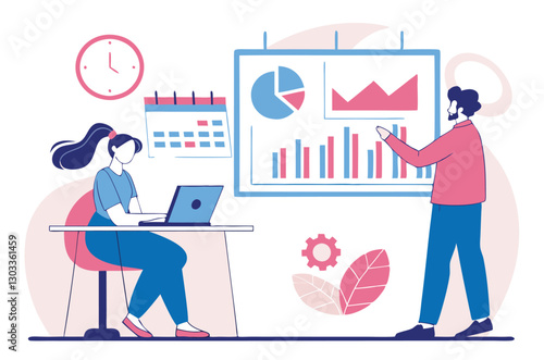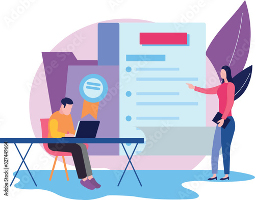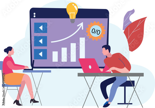 Huge laptop and micro male and female characters web developers creating website, vector illustration. Website development, web designer services composition for web banner, website page etc.