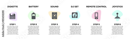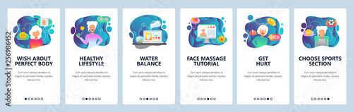 Onboarding for web site, mobile app. Menu banner vector template for website and application development. Taxes, Statistics, Contract, News, Online work, Working hours walkthrough screens.