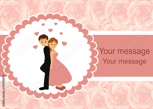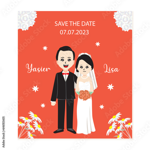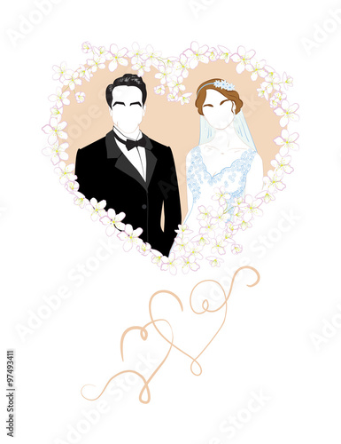 Landing page design template with wedding day headline for bridal online service. Happy newlyweds in elegant traditional dress and suit standing under marriage arch. Ceremony organization for couples