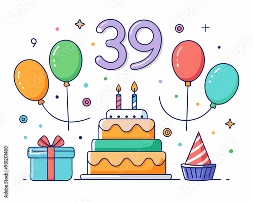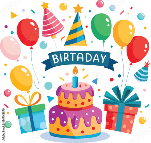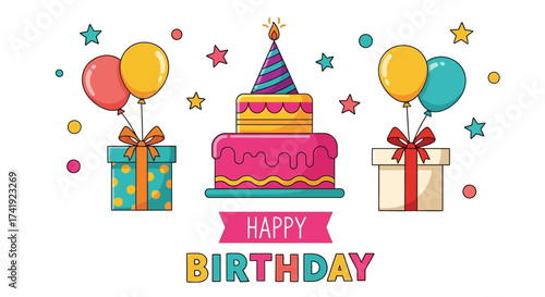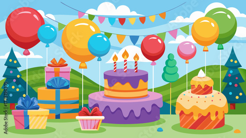 Wedding organization vector flat illustration. Three tiered cake, rings, balloons, gift boxes, bouquet of flowers, two glasses of champagne. Wedding planning services concept for website page etc.