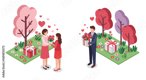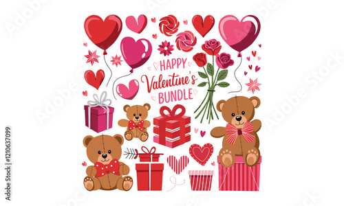 Vector flat illustration of ring with diamond, heart shaped balloons, gift boxes, bouquet of flowers, champagne, red bow tie. Wedding organization services concept for web banner, website page etc.