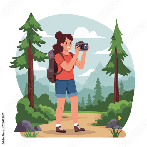 Wedding photo shoot with smart modern technology equipment concept. Man photographer taking picture of bride and groom in forest using remote controlling drone with camera vector illustration