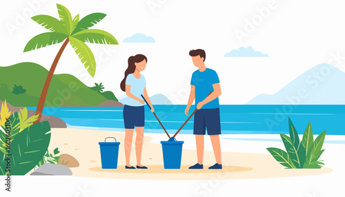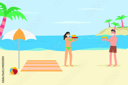 Wedding professional photograph taking photo of loving just married couple on beach coastline at sea resort vector illustration. Romantic vibes, marriage ceremony at seacoast