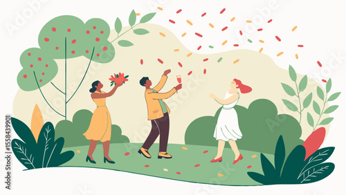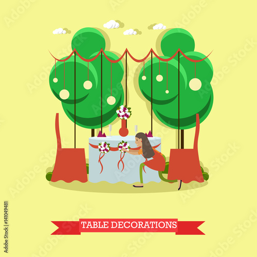 Vector illustration of woman decorating wedding table for outdoors wedding party. Flat style design element.