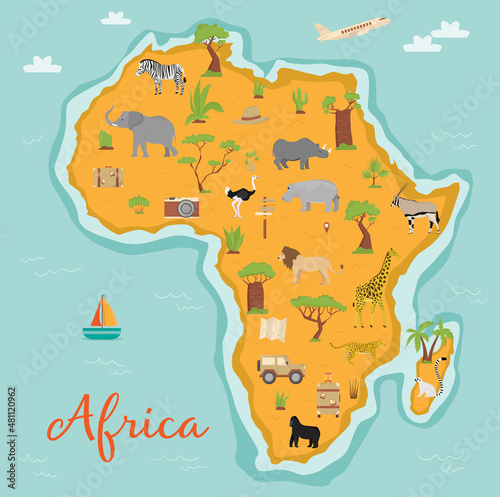 Welcome to Africa vector website template, landing page design for website and mobile site development. Paper cut Africa map with african landscape, wild animals silhouettes inside. Travel concept.