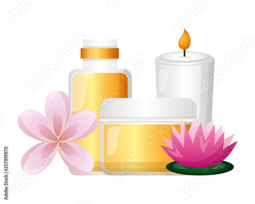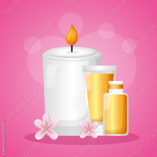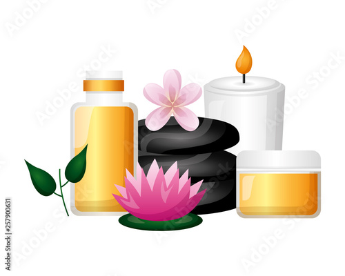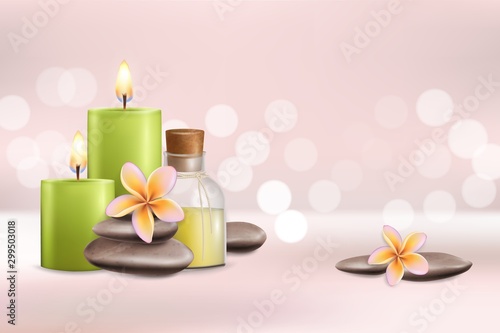 Vector realistic illustration of aroma candles, salt, massage stones, oil bottles, frangipani flowers, towels. Health and wellness spa treatment composition for poster, banner, flyer, business card.