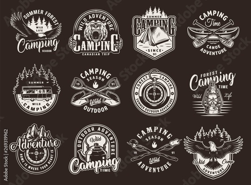 White bbq grill logo, label, badge, emblem set, vector illustration. Barbecue party, steak house vintage logos. Fresh and tasty hamburgers, steaks, kebabs, chicken. Grilled meat and vegetables.