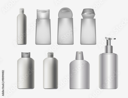 White blank bathroom cosmetic bottle mockup set, vector illustration. Realistic dispenser, spray, pump bottles on shelves. Packaging containers for cream, soap, lotion, shampoo other cosmetic products