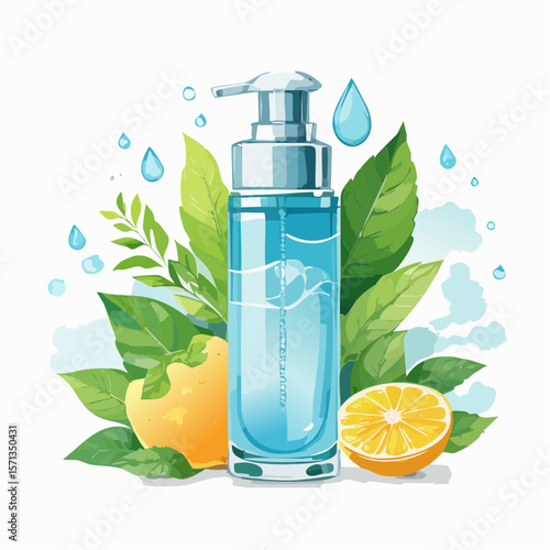 White blank cosmetic bottle mockup, paper cut craft style green mint leaves, splashes, vector illustration. Mint shampoo ads template. Beauty and hair care product.