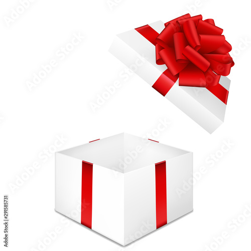White open empty gift box mockup set, vector isolated illustration. Round and square boxes and lids with red bows and ribbons for Birthday, Christmas, Wedding or Valentine Day present packaging.