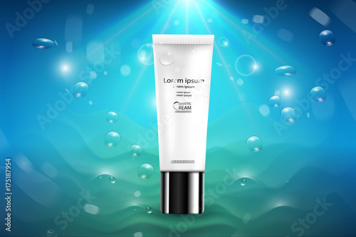 Whitening toothpaste ad poster. Vector realistic toothpaste packaging mock up with your brand on blue background with white sparkling tooth and copy space.