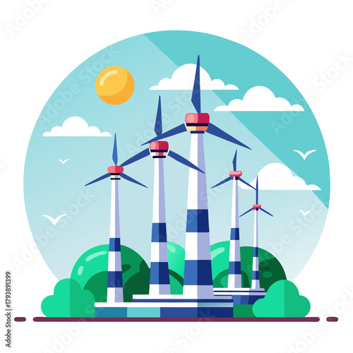 Environment conservation concept vector flat illustration. Windmills wind turbines, universal recycling symbol and green leaves. Eco nature. Wind power. Alternative energy resources.