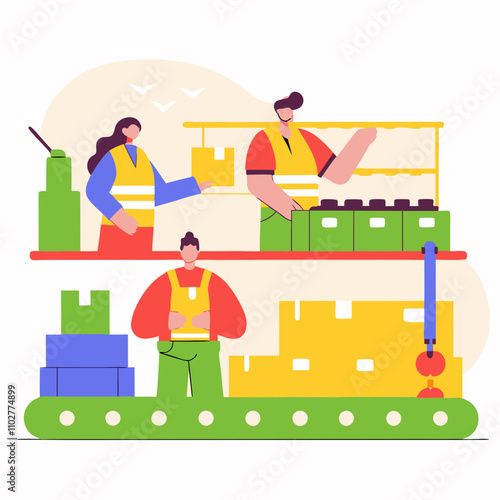 Wine production process concept vector illustration. Winery factory, people harvest grape and make wine. Winemaking technology.
