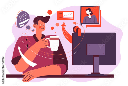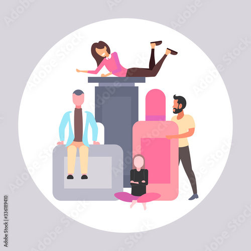 Huge bottle, micro male and female characters in restaurant, vector illustration. Couple drinking wine while sitting at table, waiter serving alcohol drink. Wine tasting concept for website page etc.