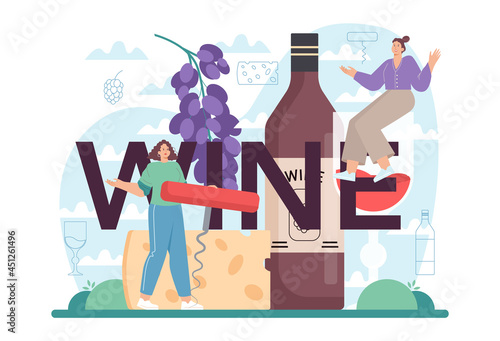Huge wine bottle, wineglass, cheese, bunch of grapes and tiny characters, vector illustration. Wine event, tasting, festival, winery concept for web banner, website page etc.