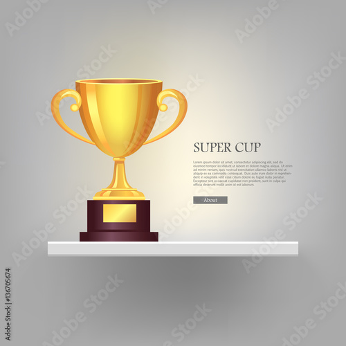 Winner blank frame and gold trophy cup on shelf, vector illustration. Certificate, diploma frame with golden goblet sport award realistic templates.