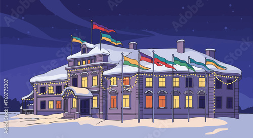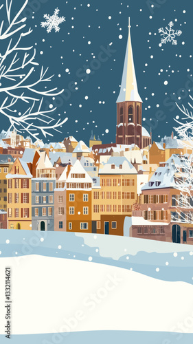 Winter and christmas holiday city landscape. Vector illustration of cute scandinavian town with ice skating rink. Family with kids playing snow on a street. Winter season background poster.