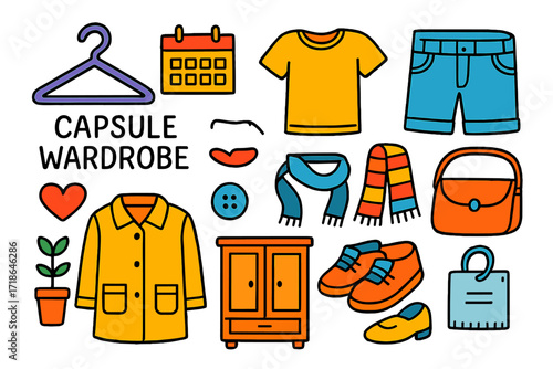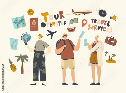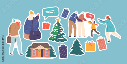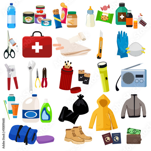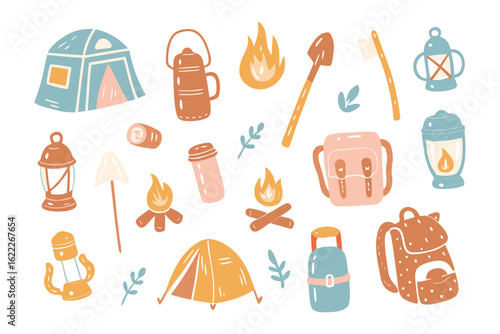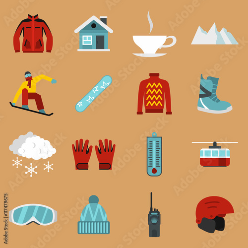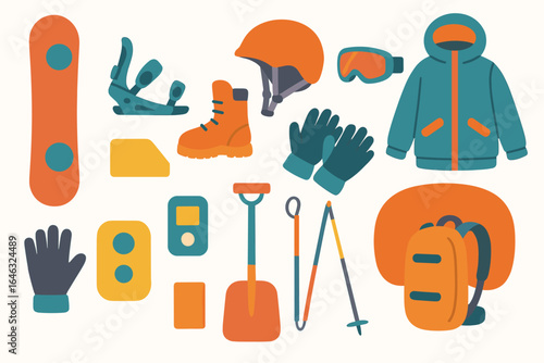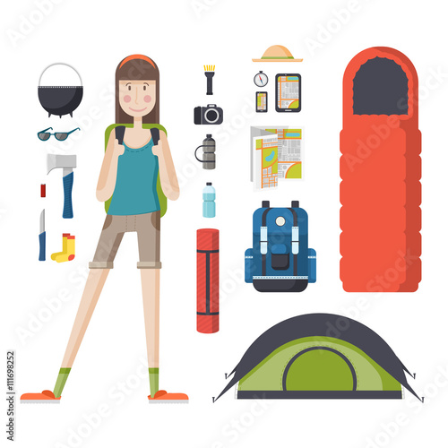 Winter hiking gear, flat vector isolated illustration. Mountain travel, climbing and winter trekking equipment. Warm clothes, backpack, compass, camping tent, ski, sleeping bag, map, hiking boots etc.
