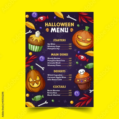 Winter hot drinks menu front and back vector design template. Christmas holiday cafe bar with food pastry dessert and beverage assortment cover illustration. Coffee-shop or tea store concept