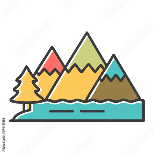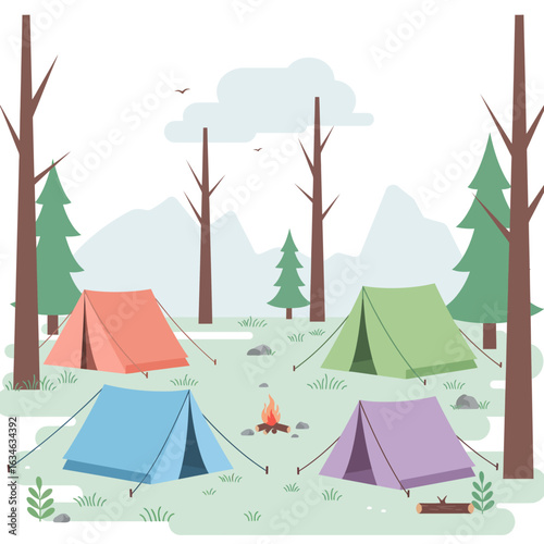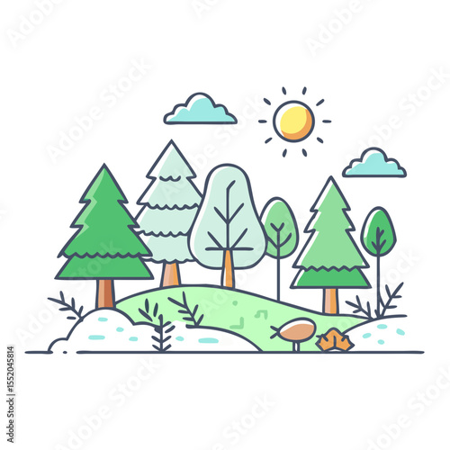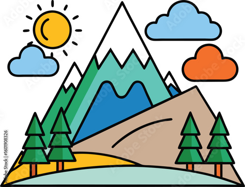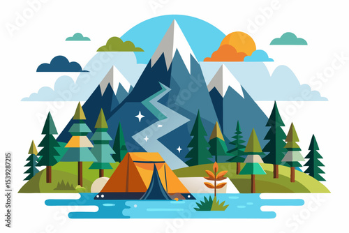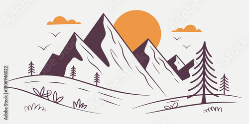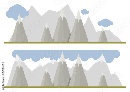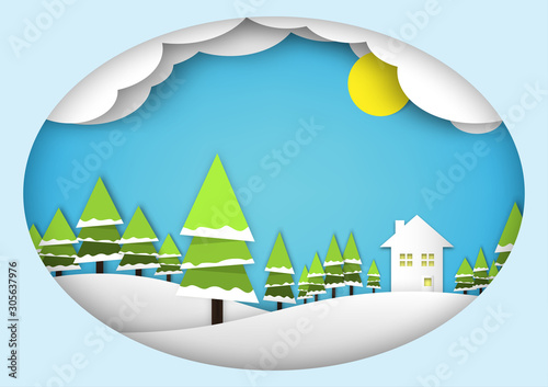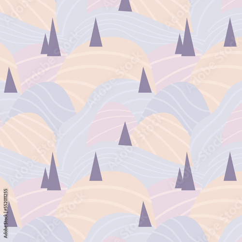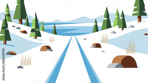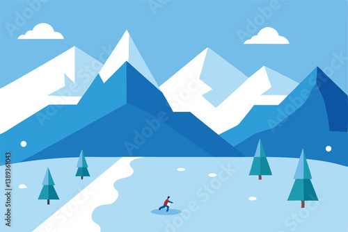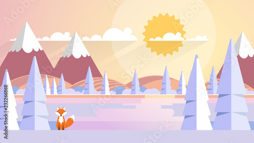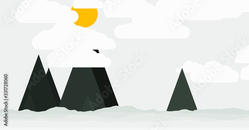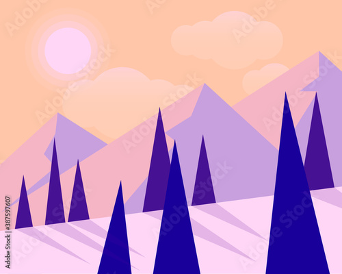 Winter mountains landscape vector 3d art design. Snowy valley with mount peak and forest tree wallpaper background. New year and Christmas concept