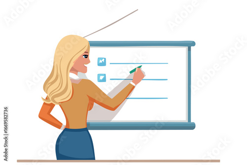 Happy woman adding check mark in to do list with tasks on smartphone screen, flat vector illustration. Task management, planning, scheduling. Checklist mobile app.