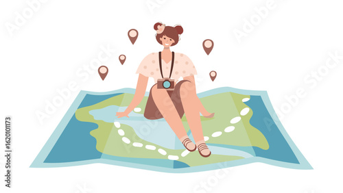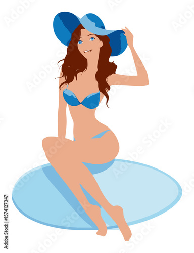 Young woman wearing swimsuit ad sun hat applying sunscreen, flat vector illustration. Sunblock, sun protection cream. Summer beach skin care routine.