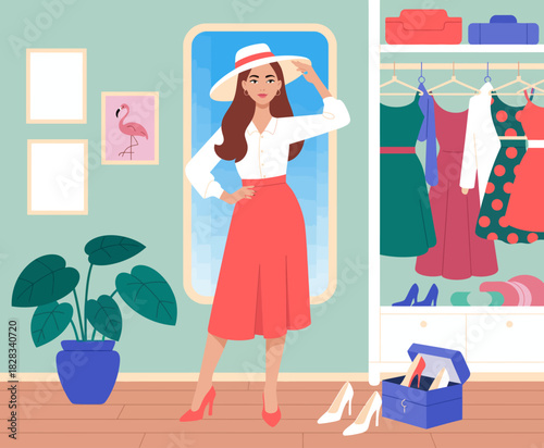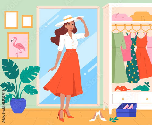 Beauty cosmetic store, makeup shop illustration. Vector woman choosing skincare product. Girl cartoon character at perfumery department. Assortment variety on shelf