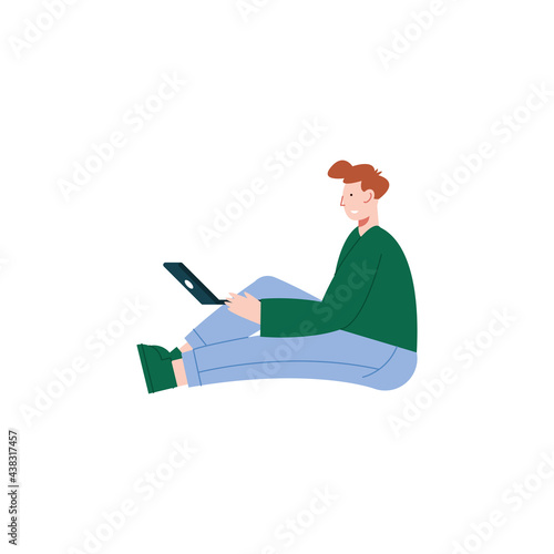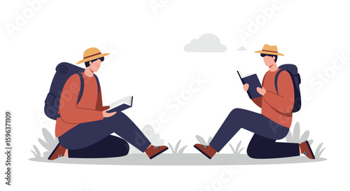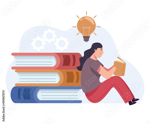 Woman character reading book and petting cat sitting on floor vector icon isolated on white background.