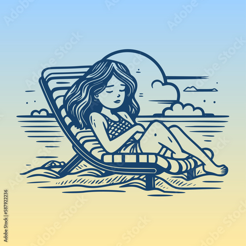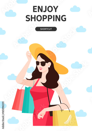 Woman choose christmas tree in a forest. Winter season vector concept illustration. Girl drinks hot wine and sit on a swing in a park.Web site design template.
