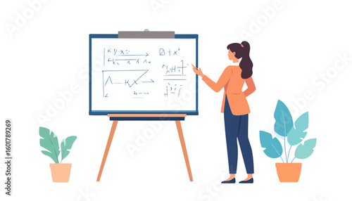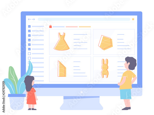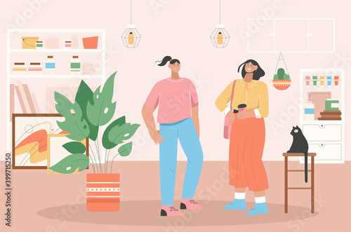 Woman customer at eyeglasses shop choosing and buying drops for eyes or contact lens liquid on showcase vector illustration. At ophthalmology store concept